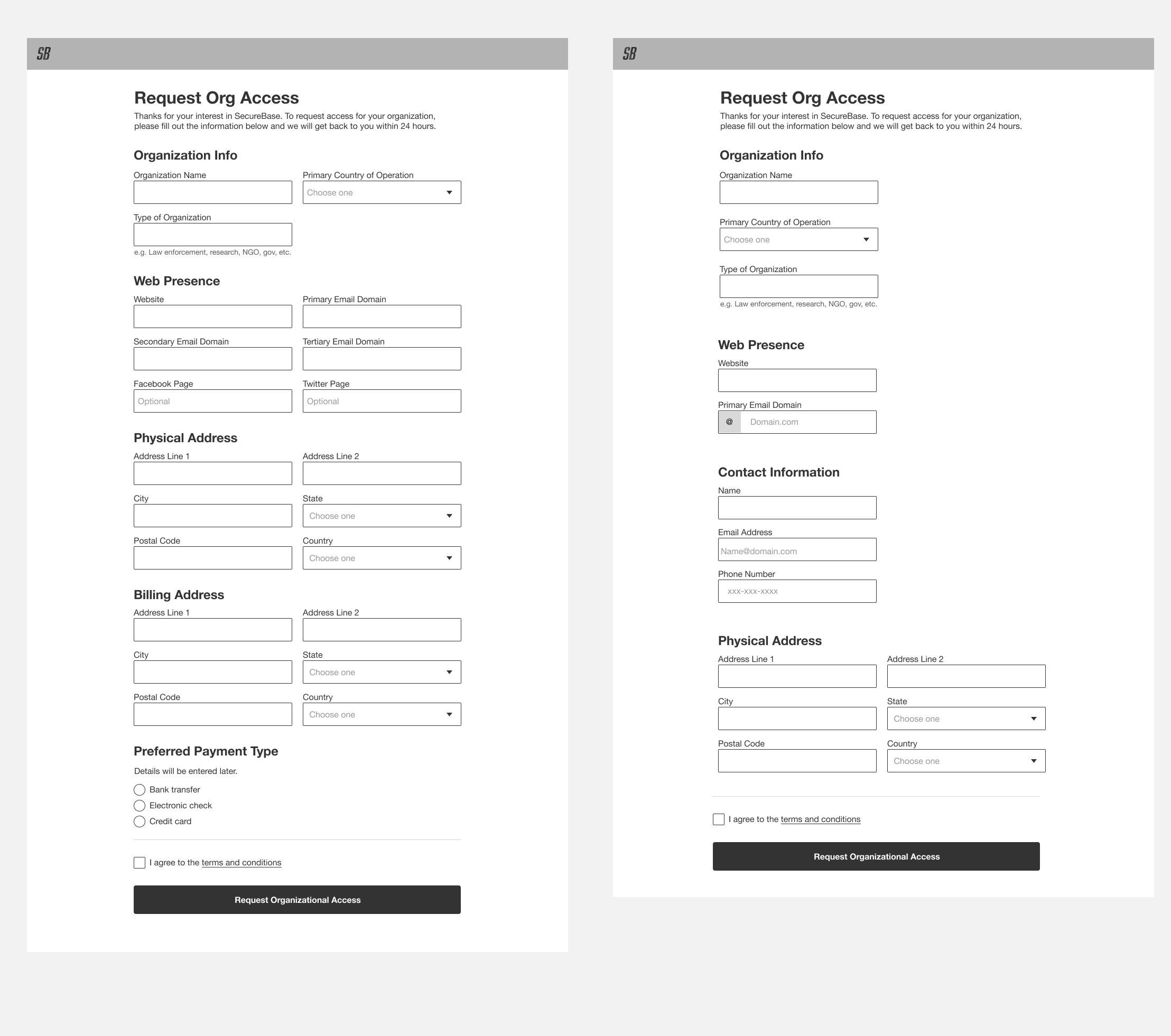 One thing I’ve learned when trying to improve the user experience is that the best interaction is no interaction. Users don’t want to have to do a lot on your app or website to achieve their goal. Here I eliminated the references to billing since we learned from the brief this service is usually free. I also removed the social media link since it is optional and doesn't need to be included in approval. I added contact information, which maybe was going to be on the next page but there needs to be a way to know and keep record that you made request and a place to confirm your access has been granted. I wasn't sure about the different type of emails so I left secondary and tertiary out. It could be something to ask the stakeholders about to determine whether it is really necessary or not. I didn't see a link to the cross check for this assignment, so please direct me to it.