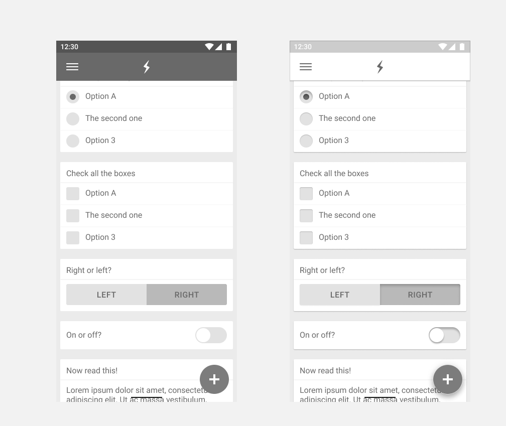 When adding light and shadows to a design I always try to remember that light comes from the sky. I tried to make more subtle changes to the cards and inactive radio and checkboxes. I wanted the active switch, floating action button, and toggle to pop.