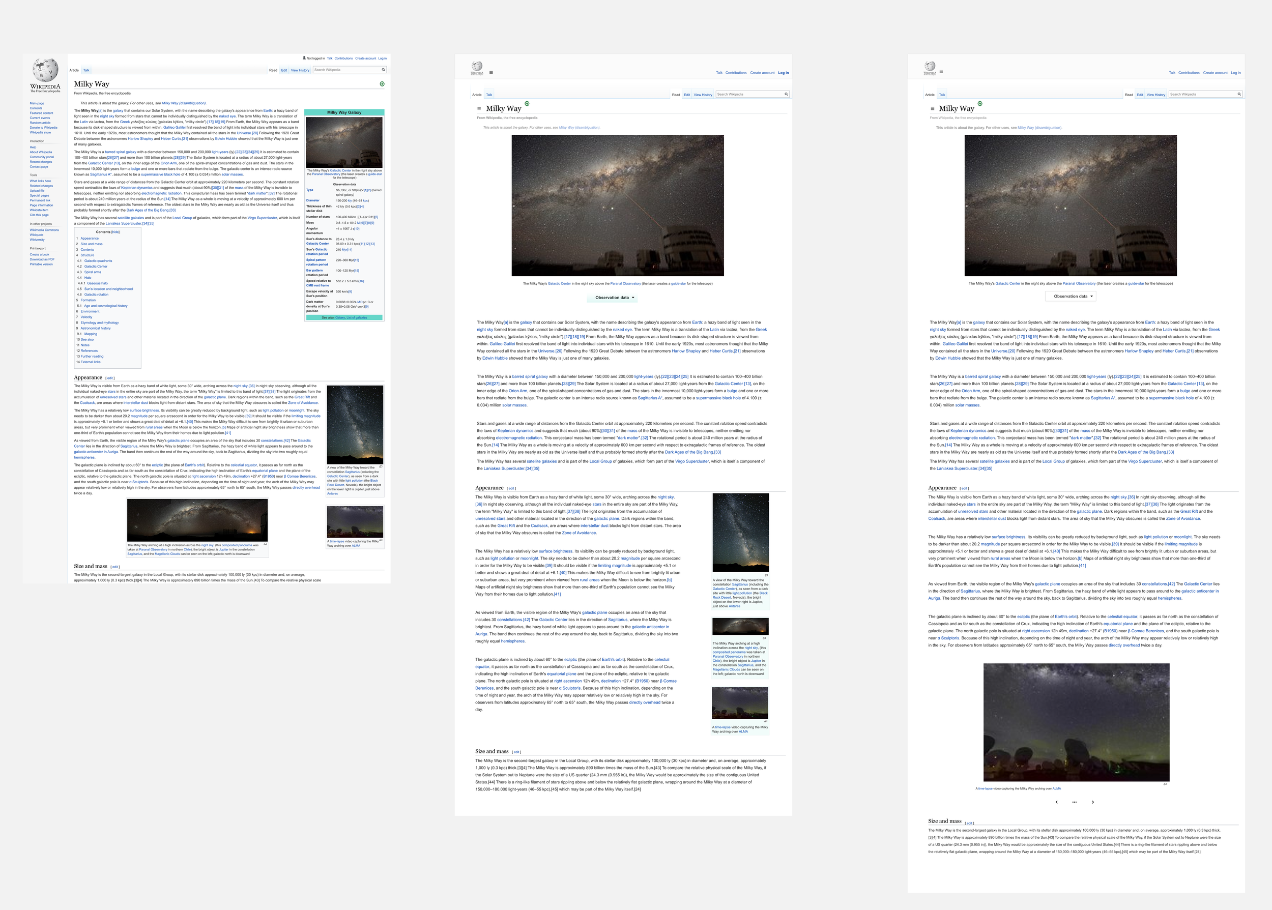 I did two versions of this one as I had difficulty figuring out how to place the different sized pics and I didn't want to remove them as they have value to those who are seeking a visual of the Milky Way. I also think a lot of people will go to wikipedia just to view the observation data so I wanted to keep it accessible but not so prominent.